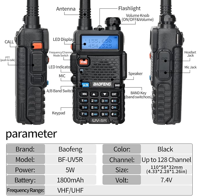 - ▶【Multifunction】Up to 128 memory channels;104CDCSS;50CTCSS;Dual-Band display; Dual-standby; Bulit-in LED flashlight; VOX function; monitor;Low battery alert;Scan function;Support manual or PC programming;Tri-color background light selectable: Large LCD Display;Easy to operate.