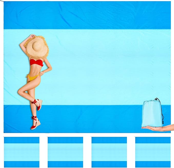 - Sandproof Beach Blanket: the 4 edges of the waterproof sandproof beach blanket can be staked to the beach to avoid it from being blown around by the wind, making it an ideal accessory for summer beach vacations