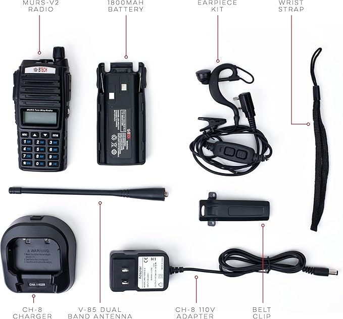 - Comprehensive Kit for Convenient Use - The MURS-V2 radio kit comes with everything you need to get started, including the radio, a 1800mAh battery, V-85 dual band antenna, CH-8 charger, CH-8 110V adapter, earpiece kit, wrist strap, belt clip, and user manual. You can use it right out of the box.