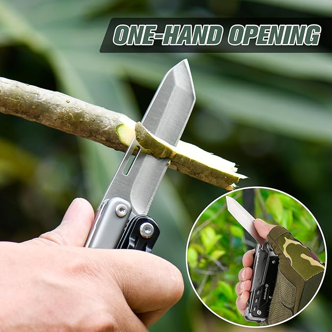 - Safety Locking: Equipped with a side lock design, each tool and knife remains securely locked in place when fully open. This innovative feature allows you to effortlessly access and operate the camping multitool with just one hand, a distinctive advantage among multi-tools.