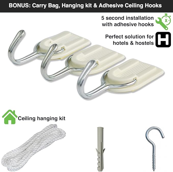 - LIGHTWEIGHT & EASY SETUP! The net weighs just 0.8 lb and can easily be set up with only one attachment point. A compact carrying bag, hanging kit and self-adhesive ceiling hooks are included.