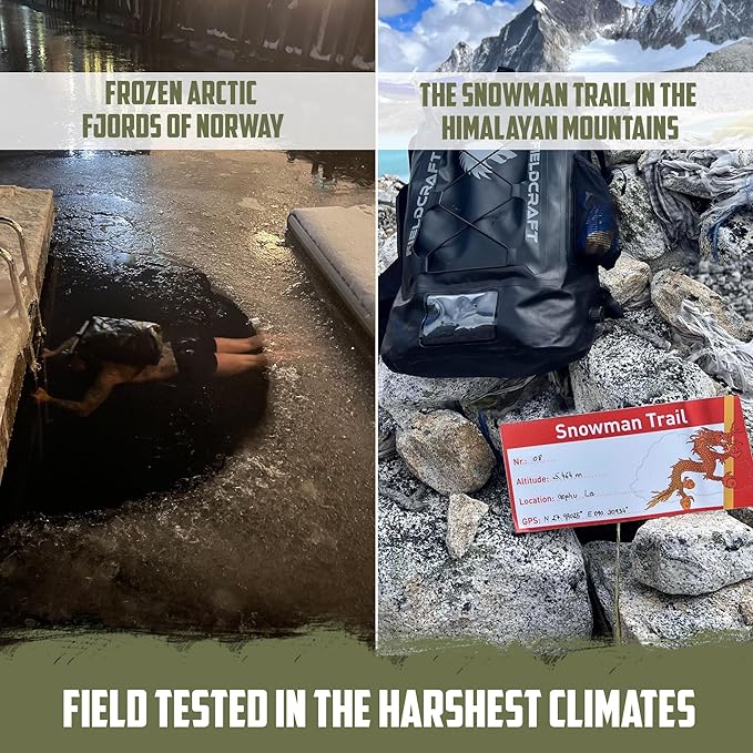 - TOUGH WATERPROOF MATERIAL: 500D vinyl coated woven polyester with RF welded seams create the highest performing watertight seals. Our material selection provides superior tear and abrasion resistence and will not crack in extreme temperatures unlike competing brands. To prove it our Wayfarer pack was tested and used on the ardous grueling Snowman Trail, the icy fjords of Norway and the jungles of Central America.