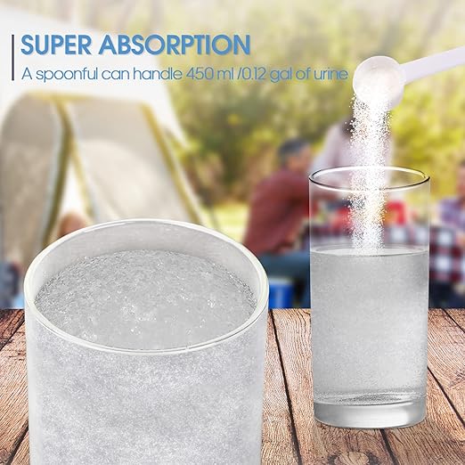 - MOST ECONOMICAL! - 35.27 oz, 150 use. Porta potty chemicals, made of sodium polyacrylate, just a spoonful can handle 450 ml/0.12 gal of urine, solidifying several hundred times its own weight in seconds. Perfect for camping, hiking, and other outdoor activities.