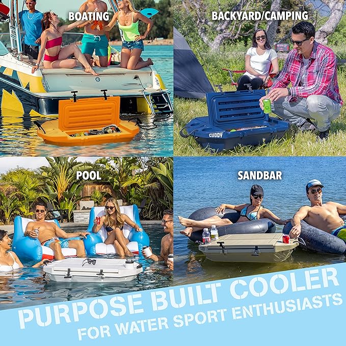 - SOCIAL FLOATING: Always have your cold drinks within reach, in and out of the water; Easy cooler access with 2 large lids and 4 built-in cup holders; Anchor your CUDDY on the sandbar, tie-off on your boat or tow behind your kayak