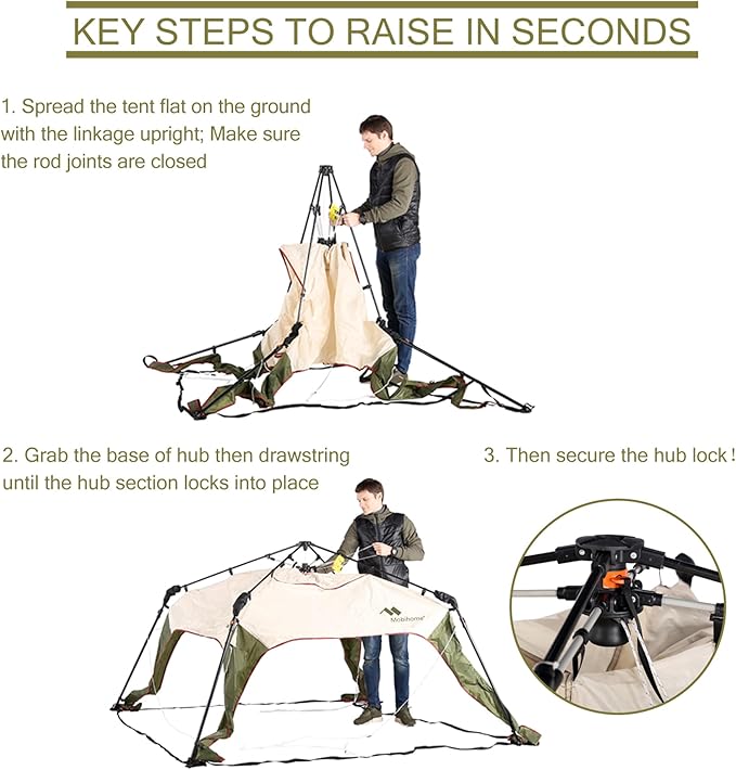 - INSTANT QUICK UP CANOPY TENT - Special hub system design for single operation - The fastest and easiest set up and take down; Roll it out, lock your poles, pull the drawstring and QUICK UP the canopy, NO MORE complicated operation!