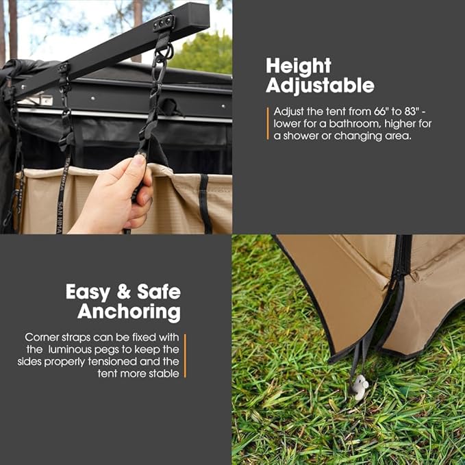 - Customizable Height: Designed for quick setup, this tent unfolds and secures with pegs in just 30 seconds. Adjustable straps let you lower it for a bathroom or raise it for a shower or changing area, with a height range of 66.92 inch to 82.68 inch to fit various vehicle heights and easily mount to your 4x4 or camper trailer. Structural poles in the bottom seam ensure stability, so you can hang towels and store items without sagging.