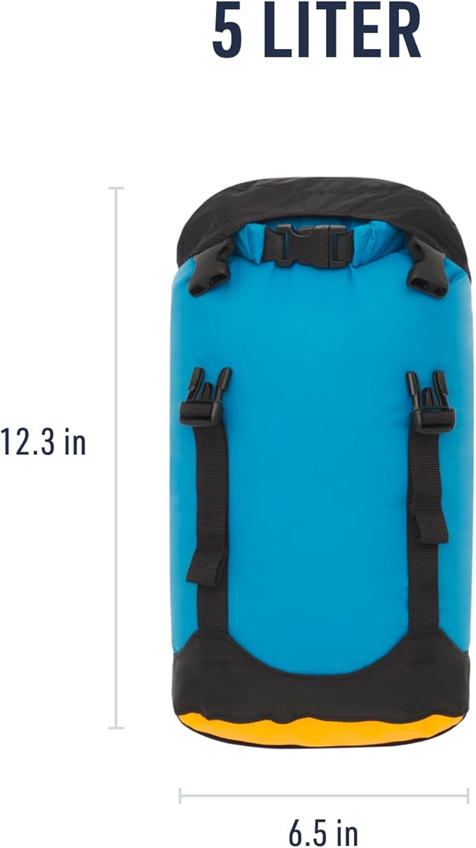 - 5-liter compression dry bag measures 6.5 x 5.8 x 12.3 inches when closed, and weighs 0.22 pounds; volume is 5 liters (with closure rolled three times)