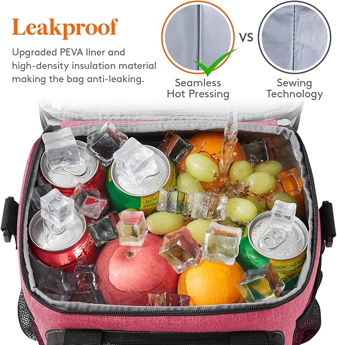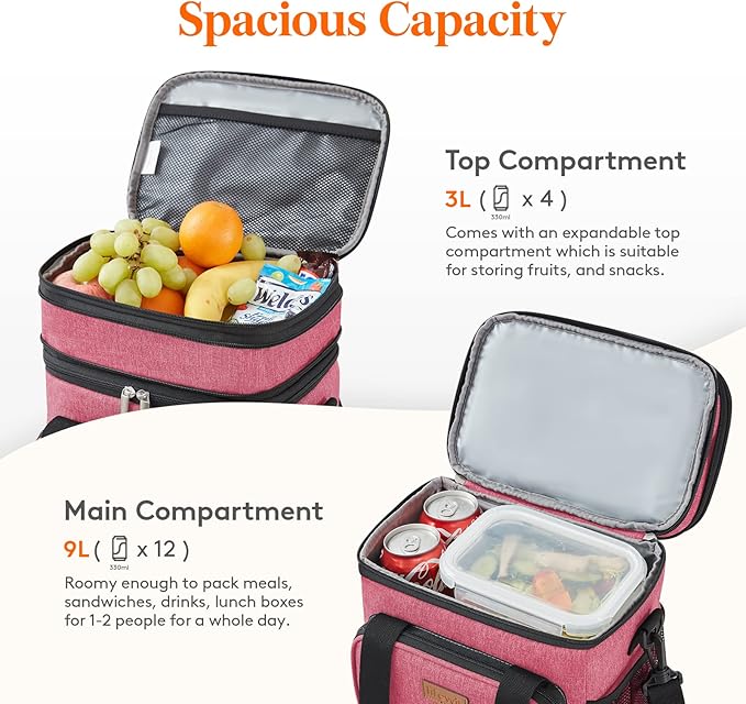 - Spacious Capacity: Measures 10" x 6.7" x 9.5" with a 9L capacity, fits 12 cans of 330ml coke. The expandable top compartment adds 3L of space, increasing the total capacity to 12L and fitting 16 cans of 330ml coke. Expanded size: 10" x 6.7" x 11". Ideal for packing meals, sandwiches, snacks, drinks, fruits, and lunch boxes.