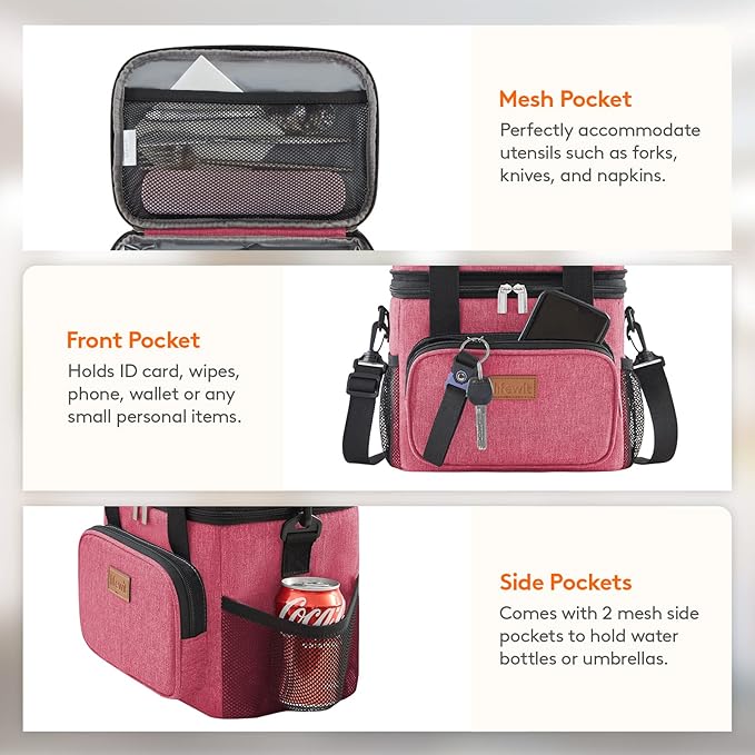 - Multiple Pockets: This lunchbox for adults features a main compartment for drinks or food, a top compartment with a mesh pocket for fruits and snacks, a front pocket for essentials like phone, wallet, and keys, and 2 mesh side pockets for small water bottles or umbrellas.