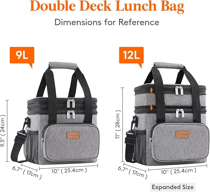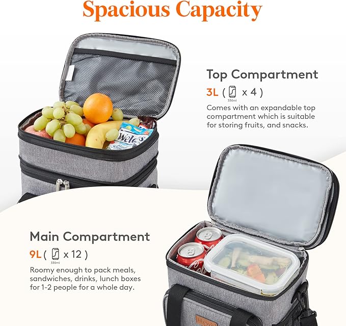 - Spacious Capacity: Measures 10" x 6.7" x 9.5" with a 9L capacity, fits 12 cans of 330ml coke. The expandable top compartment adds 3L of space, increasing the total capacity to 12L and fitting 16 cans of 330ml coke. Expanded size: 10" x 6.7" x 11". Ideal for packing meals, sandwiches, snacks, drinks, fruits, and lunch boxes.