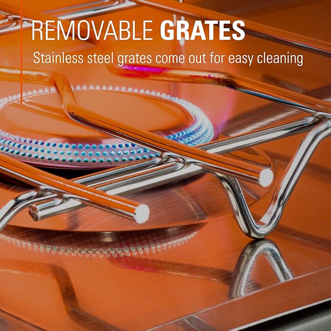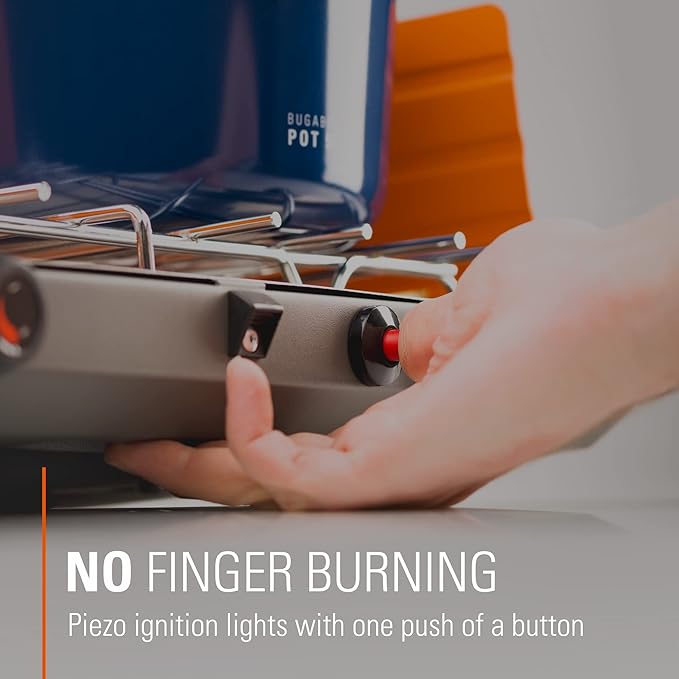 - Powerful, twin 14,000 BTU burners rapidly heat larger pots and pans; Piezo ignition lights stove with the push of a button without burning finger-tips