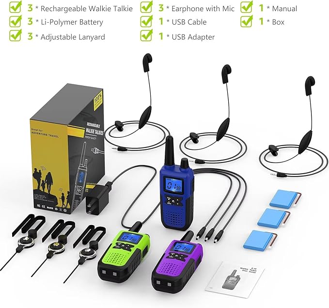 - Included Components : Walkie Talkies for Adults Working, Kids Playing, High-Capacity Batteries for Extended Talk Time, USB Charger Y Cable for Fast Simultaneous Charging, Original Earpiece and Mic Sets for Private Chats, Belt Clips & Adjustable Lanyards for Ease of Carry Walkie Talkies for Adults Working, Kids Playing, High-Capacity Batteries for Extended Talk Time, USB Charger Y Cable for Fast Simultaneous Charging, Original Earpiece and Mic Sets for Private Chats, Belt Clips & Adjustable Lany… See more