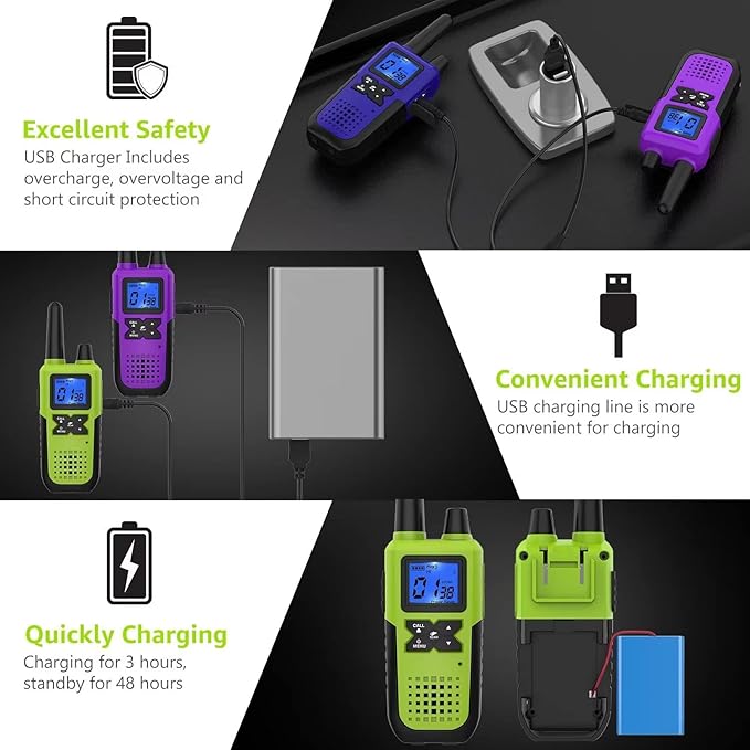 - 【Complete Set for Instant Use】 : Unbox to find everything you need: rugged walkie talkies for all ages, original earpiece and mic sets for private chats, original USB charger for rapid charging, Y cable for simultaneous charging, high-capacity battery for extended communication time, belt clip and adjustable lanyards for ease of carry. Your one-stop communication solution is here, whether for work, play, or anything in between