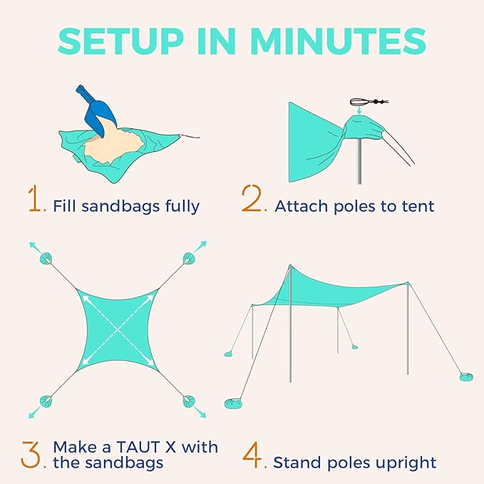 - EASY SETUP BEACH TENT: No more guesswork when assembling! Our design makes it foolproof and stress-free to set up beach shade quickly. Just read the instructions printed on the pole bag, and you can use it at sandy beaches or grassy areas