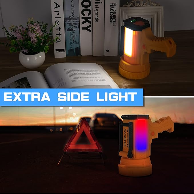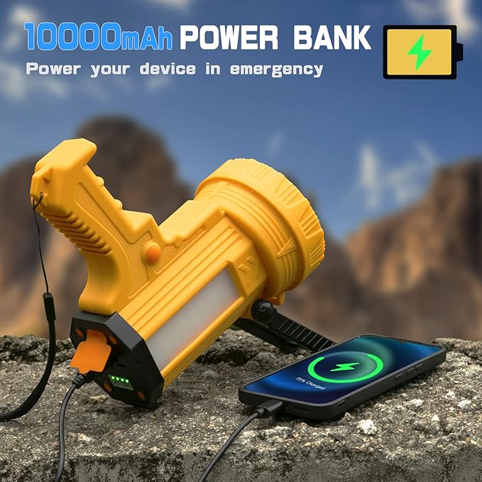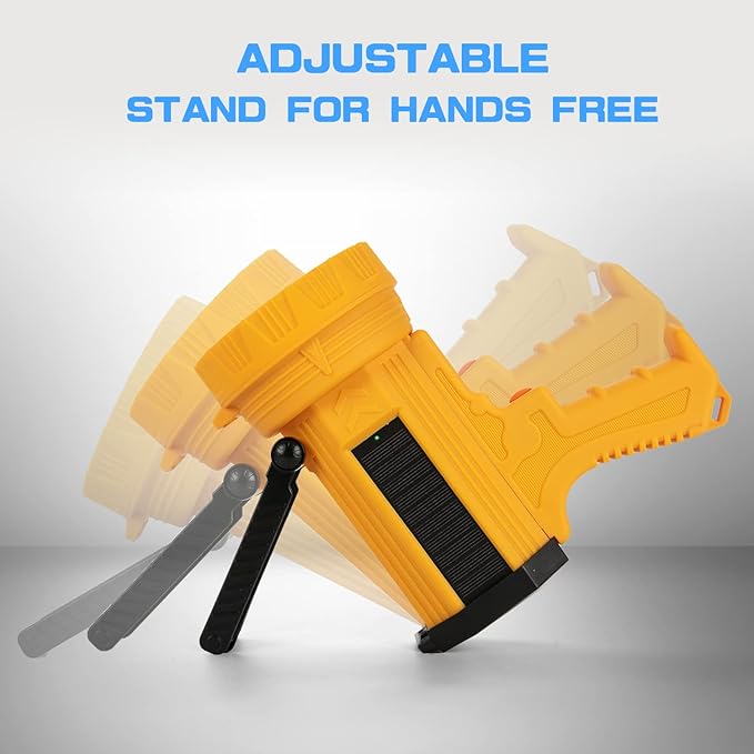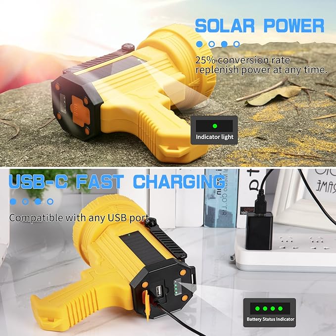 - USB C FAST CHARGING & SOLAR POWER: With advanced USB-C charging technology, recharge in just 4 hours. Compatible with any USB charging port, you can charge this handheld spotlight at home or in your car (charging adapter is not included). The high-efficiency solar panel can always replenish the power of the flashlight in time, so there is no need to worry about long-term power outages or battery power being exhausted.