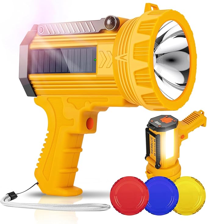 YIERBLUE Solar & Rechargeable Spotlight Flashlight, 1000,000 High Lumen Outdoor Handheld Spot Lights with Flood Light Searchlight, Foldable Stand and 3 Colors Lenses for Boating Hunting and Camping