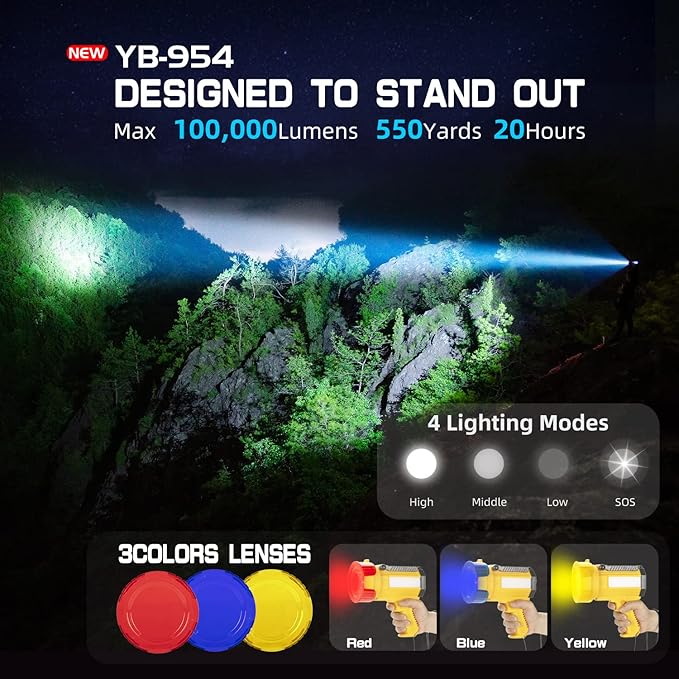- UPGRADED BATTERIES: Instead of the type of batteries most flashlights use, polymer batteries are used. So our spotlights have very high safety performance, just like your mobile phone. Powered by 10000 mAh rechargeable batteries, the YB-954 spotlight boasts a max runtime of 20 hours that you can always count on.
