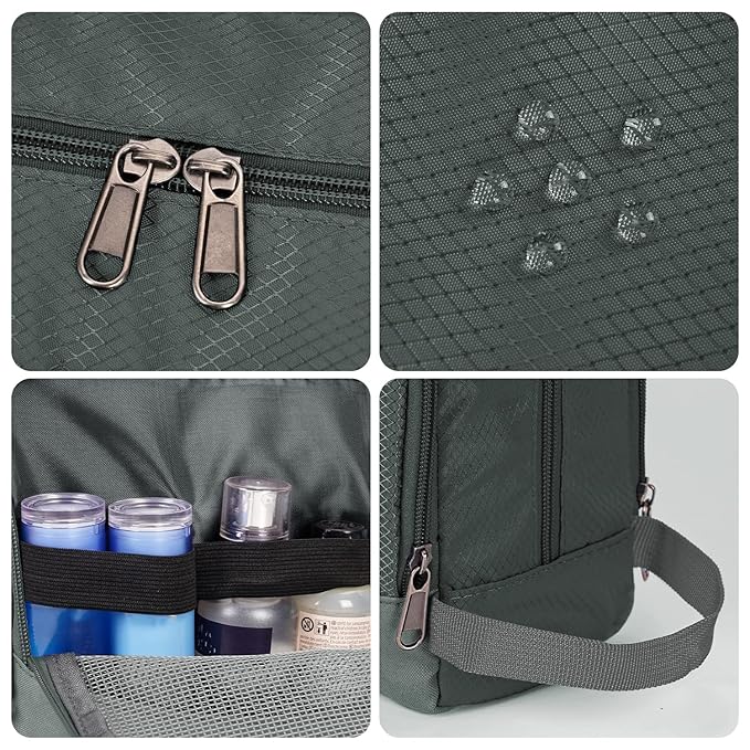 - 【ORGANIZED COMPARTMENTS】 --- Main compartment that holds larger items such as shampoo bottles or shaving cream. One zippered mesh pouch that keeps your smaller toiletries and cosmetics in a place visible and breathable. Other side front zipper pocket that provides extra storage with easy.
