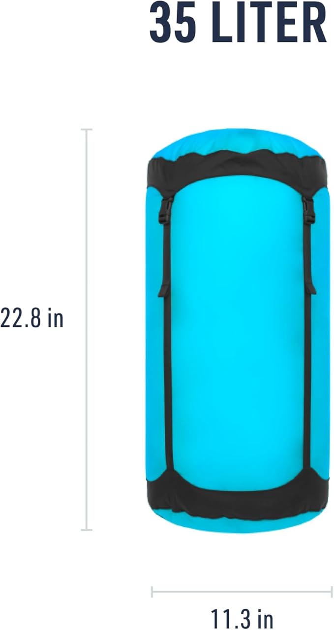 - 35-liter compression sack measures 11.3 x 22.8 inches and weighs 0.26 pounds; volume is 35 liters