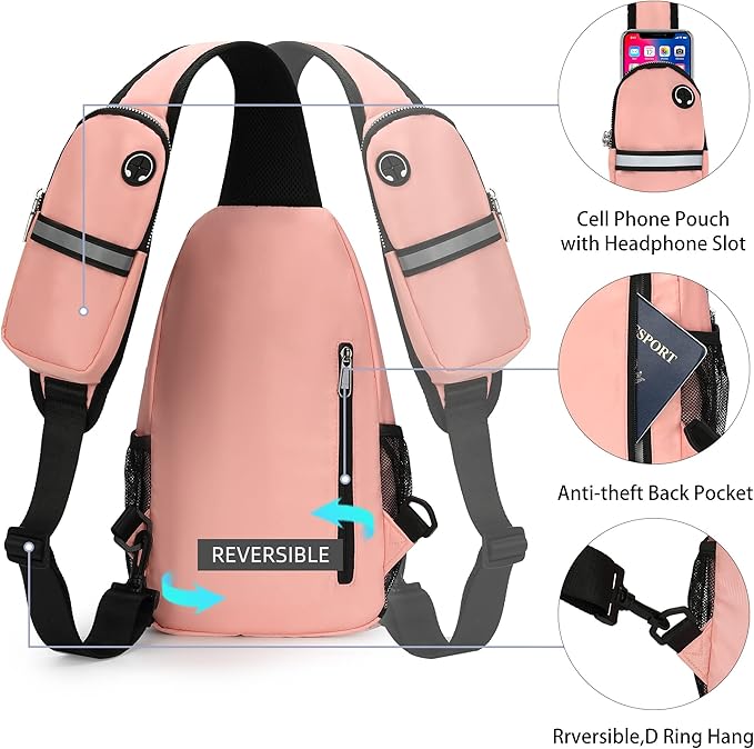 - Unique Design: The sling backpack has a hidden pocket in the back, you can safely store your bank cards or passports, etc., reducing the risk of theft.The shoulder strap pocket is 3.5 x 1.5 x 7.5 inches and can hold a phone up to 12 inches. The shoulder strap pocket has a headphone jack so you can enjoy music anytime, anywhere.This multipurpose shoulder bag is a great travel essentials.