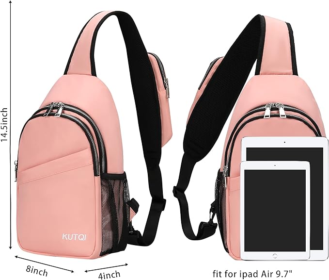 - Keep Everything Organized: Dimensions:14.5x8x4 inches / 37x20x10 cm.The sling bag contains 7 main pockets, a front pocket,two side pockets and a back pocket.The main pocket can put iPad,books,power bank,etc.Side pockets hold water glasses and umbrella.There are also multiple small pockets for your passport, cards, pens and more.Allows you to arrange your items in an orderly manner, making travel more convenient.
