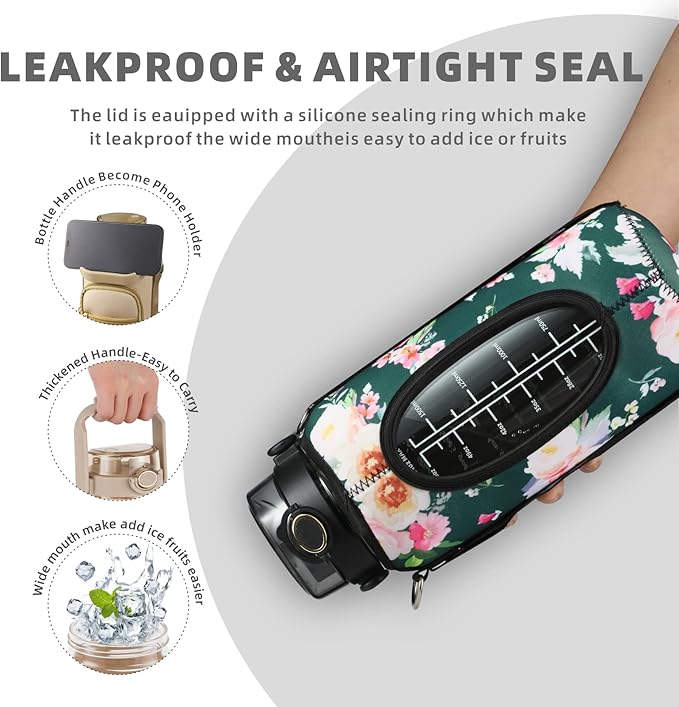 - Glass Water Bottle With Sleeve and Strap: This glass water bottle with straw is designed with high quality 5mm Neoprene sleeve to protect water bottle from slight bumps and absorb sweat to avoid dripping on table or seat. It’s an all-in-one water tracker bottle, water bottle sleeve with 2 pockets to storage phone, card,airpods, key and motivational water bottle with comfortable padded shoulder strap & wrist strap for hands free carrying. You can adjust the strap ensure a snug fit