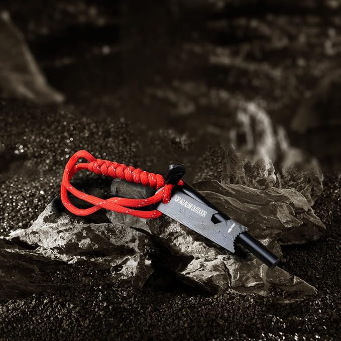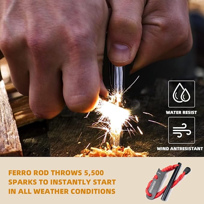 - BONUS EXTRAS - The fire starter kit comes with a range of unique extras, including a Magnesium Fire Starter, Wrist lanyard, Versatile tool (Striker with spark optimized edge, hex wrench, ruler, map scale, Carabiner, and Emergency whistle).