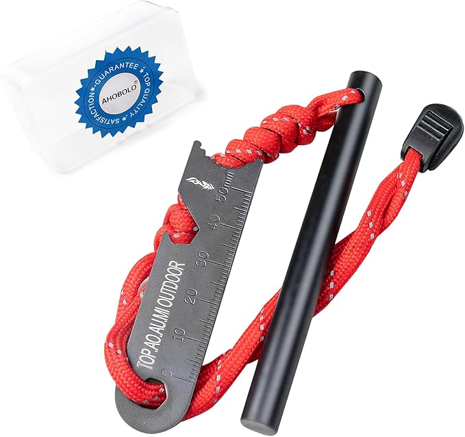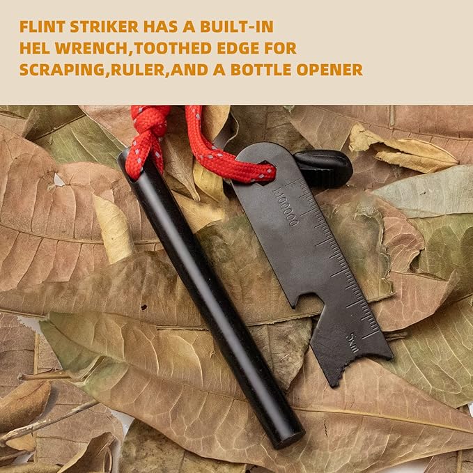 - BONUS EXTRAS - The fire starter kit comes with a range of unique extras, including a Magnesium Fire Starter, Wrist lanyard, Versatile tool (Striker with spark optimized edge, hex wrench, ruler, map scale, Carabiner, and Emergency whistle).
