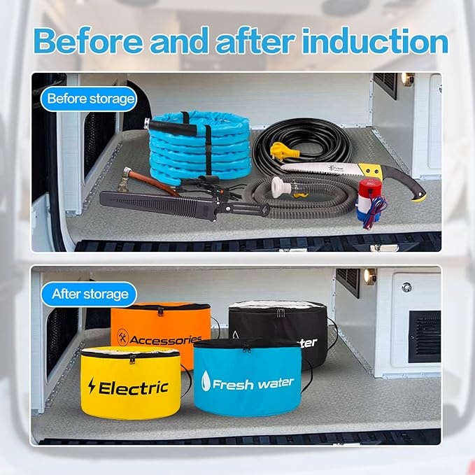 - TWO-WAY ZIPPER CLOSURES & WATERPROOF LINER: Our 4 packs of camper storage bag are upgraded to double zipper closure for more convenience than traditional drawstring designs. And the interior liner of rv must have bags are fully waterproof so you won’t need to deal with gross and soggy when putting hose away for storage.
