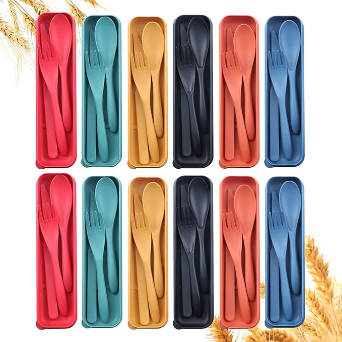 Reusable Travel Utensils Set with Case,12 Sets Wheat Straw Portable Plastic Fork Spoons Knife Camping Cutlery, Eco-Friendly BPA Free Lunch Tableware Travel Picnic Silverware for Kids Adults Daily Use