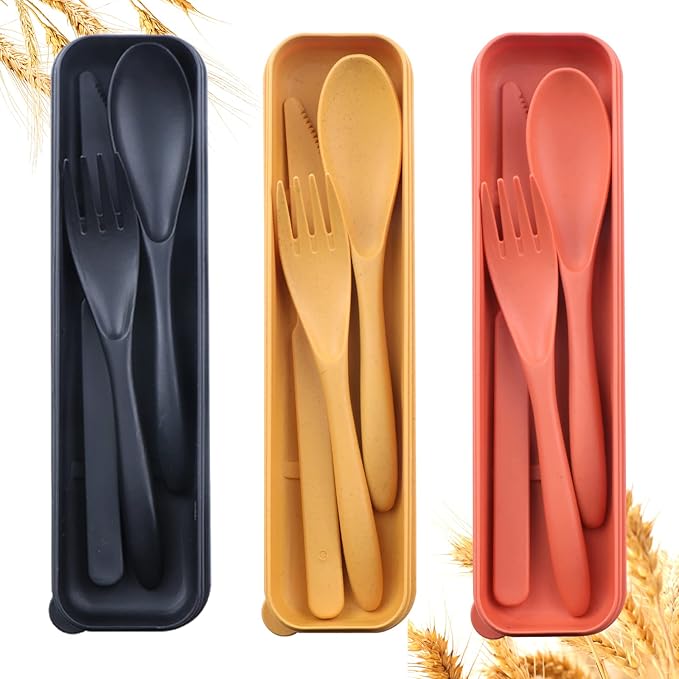 Reusable Travel Utensils Set with Case, 3 Sets Wheat Straw Portable Plastic Fork Spoons Knife Camping Cutlery, Eco-Friendly BPA Free Lunch Tableware Travel Picnic Utensils for Kids Adults Daily Use