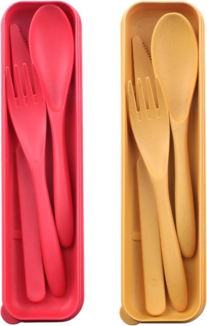 Reusable Travel Utensils Set with Case, 2 Sets Wheat Straw Portable Plastic Fork Spoons Knife Camping Cutlery, Eco-Friendly BPA Free Lunch Tableware Travel Picnic Utensils for Kids Adults Daily Use