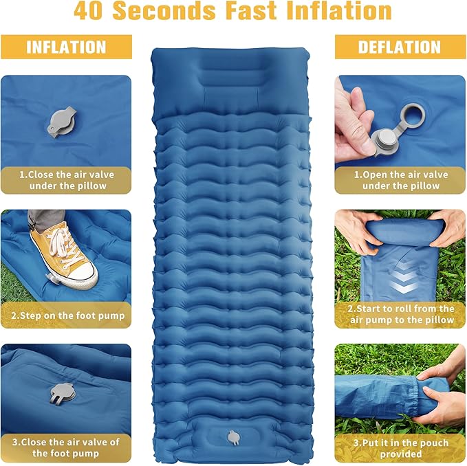 - 40s Fast Inflation:The STURME camping sleeping mat is equipped with a durable built-in foot pump, it only takes about 40 seconds to fully inflate. The leak-proof membrane makes air leakage no longer bother you. 5-second deflation for quickly pack up