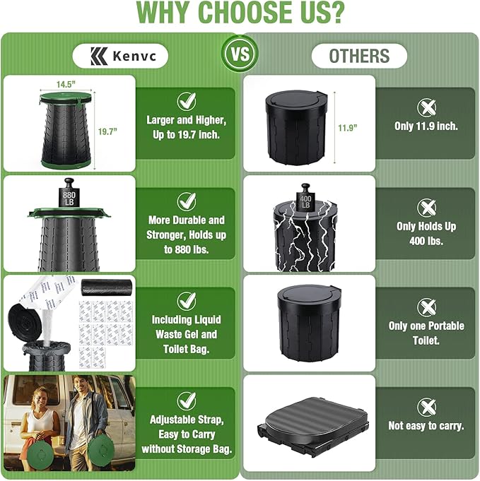 - Super Large Size: As we know, Americans are much taller than the world average, so we are uncomfortable with low portable potty. Unlike camping toilets that are often not high enough for adult men, our travel toilet has a height of 19.7 inches, 51% taller than many portable toilets (13 in). Additionally, we've widened the seat cover to provide extra comfort when seated. Package includes: 1 x Travel Portable Potty, 12 x Anti-Slip Base,10 x Coagulant Powder, 10 x Portable Toilet Replacement Bags.