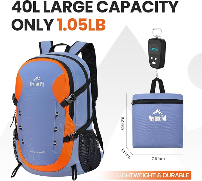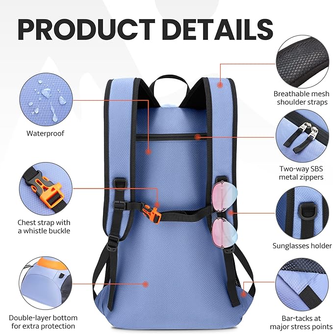 - Compact and Comfortable: It weighs only 1 pounds, can easily fold into its own pocket for storage,and unfold it when you need it. Perfect all-purpose carrying bag for traveling , easily fit in the luggage. Breathable mesh shoulder straps with plentiful sponge padding help relieve the stress from your shoulder. The chest clip with a whistle buckle work perfectly to distribute the pack’s weight and keep it steady and centered. A must have for sports , hiking and camping