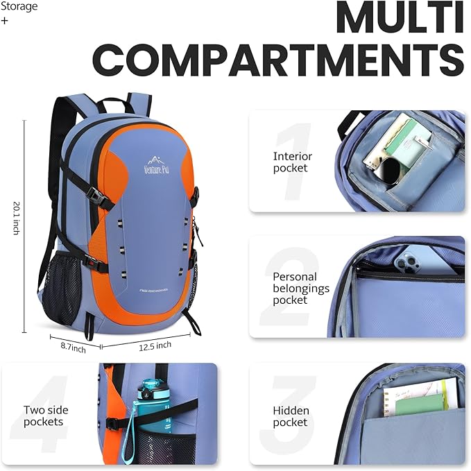- Large Capacity and Multi Compartment: With 40L storage space, this backpack features with multi-compartment design includes one main zipped compartment, one zipped front pockets and two side pockets. One separator and one small zippered pocket in the main compartment are convenient enough to help you further organize things, can carry water, trail snacks, rope, and standard tools, the portable bags for climber. Large capacity helps you easily organize all your essential items