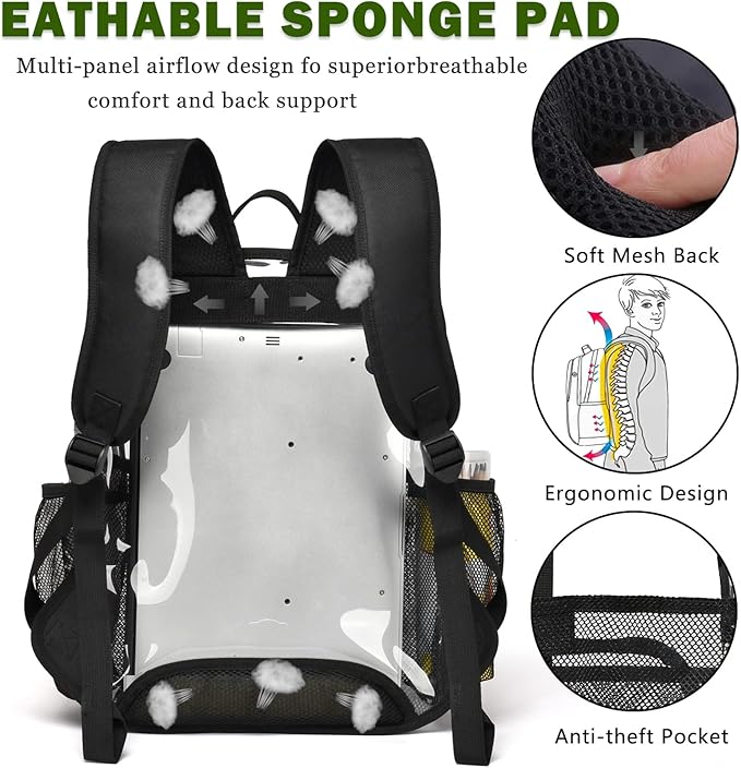 - Ergonomic Design See Through Backpack -Ergonomic design of S-shape padded shoulder straps and padding back design, made from high elastic and breathable sponge and fabric, equipment with ring type adjustable hasp, adjust the strap length freely , reduce the burden of weight, protect the back and shoulder effectively, more comfortable for your life.