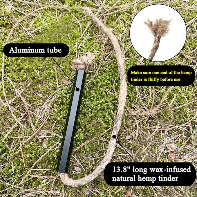 - EASY TO CARRY: You don't have to worry about losing these fire starter survival tools, because besides the fire steel and hemp tinder, you will also get a strong and durable multifunctional bag and a large aluminum alloy hook. You can put fire steel, hemp tinder or other tools you need into the bag.