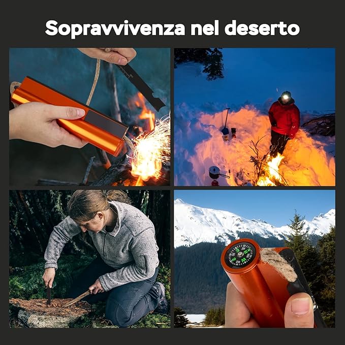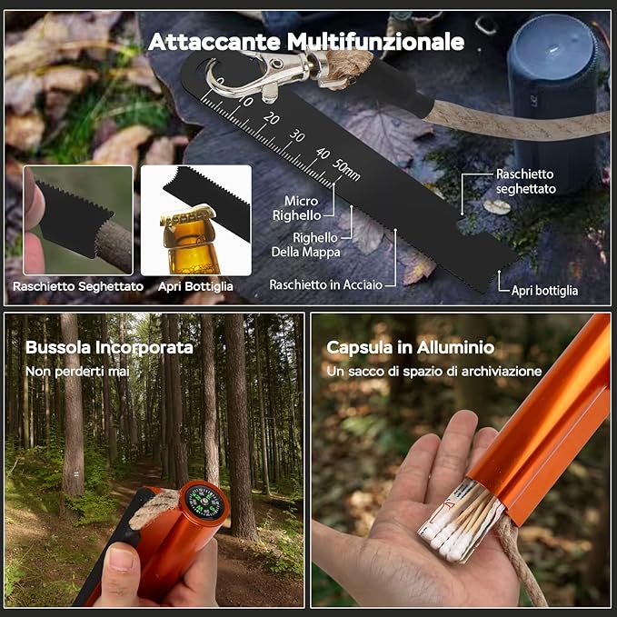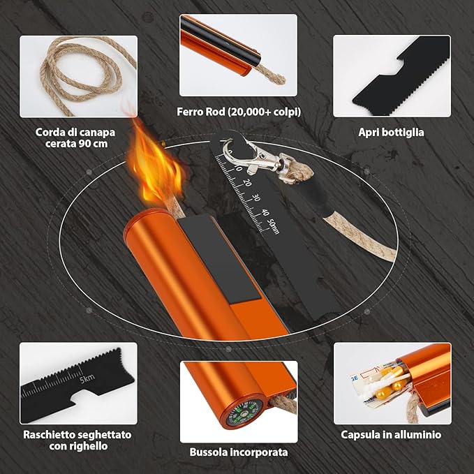 - 👍【7-in-1 FIRE STARTER KIT】The survival fire starter set is a perfect tool as it combines utility and convenience, which includes a long waxed cord 36 Inch, aluminum storage capsule, built-in compass, high-quality steel striker. The multifunctional striker comes with a ferro scraper that can be used as a bottle opener and serrated scraper.