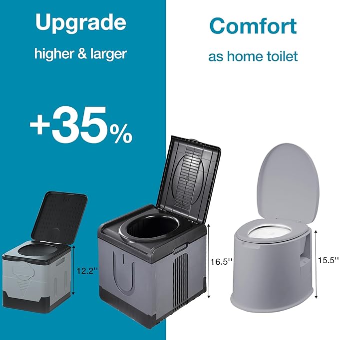 - 【HIGHER & LARGER】 Featuring 40% increased height and a wider seat, this portable toilet provides a smooth and comfortable experience that is ideal for all adults, just like you're sitting on your own toilet at home even when you're out, no more worrying about cramped and uncomfortable toilets.