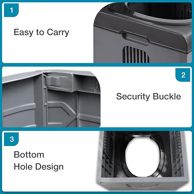 - 【THOUGHTFUL FEATURES】Featuring with two handles for easy carrying and four security buckles ensure your toilet remains upright and secure, prevent any spills or accidents. Also the plastic material is waterproof and easy to clean.