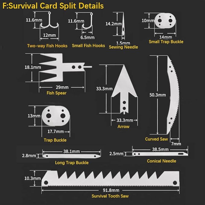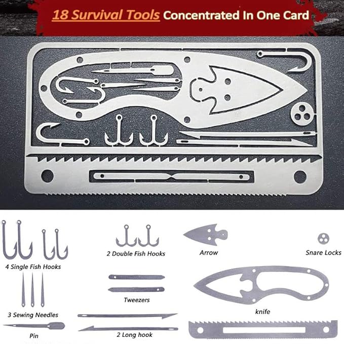 - ∝Emergency Survival:A really great cards Including fishhook,chain saw,Trap hook,fish spear,sewing needle,fish tape,Hook Sharpener