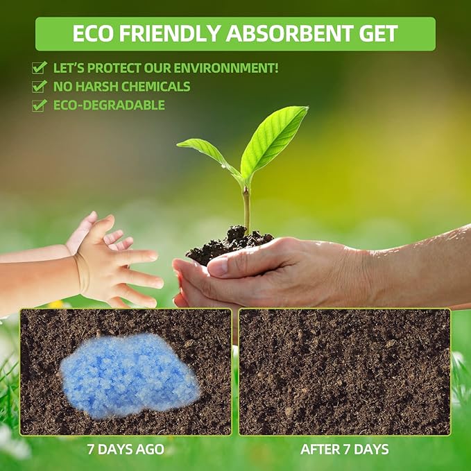- 【Premium Eco-Friendly & Degradable Gel】Our absorbent gel powder is mainly made of a super absorbent polymer. It can absorb and retain an extremely large amount of liquid relative to its own mass while emitting a light lemon fragrance. The gel powder is eco-friendly and safe to use, allowing you to always maintain an elegant environment. This safe and non-toxic eco-absorbent gel can naturally degrade in 7 days through soil composting or in just 5 days when exposed to sunlight.