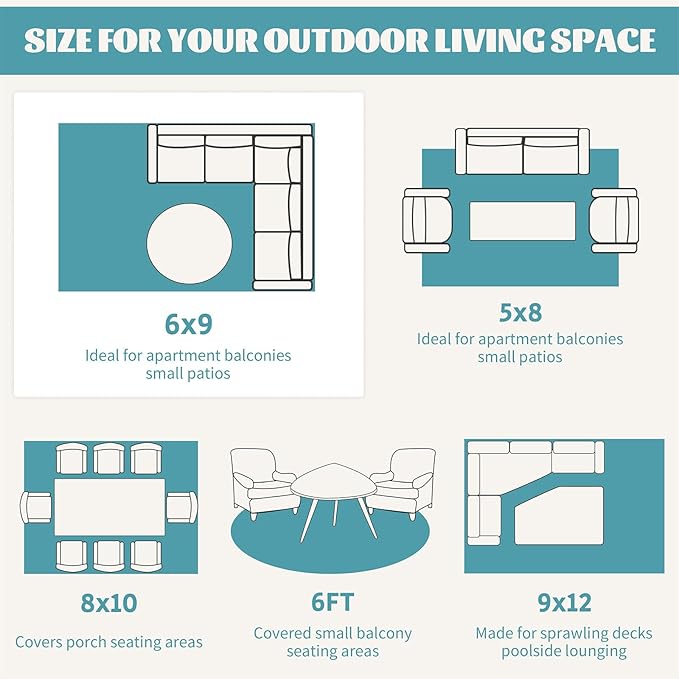 - Waterproof & Easy Cleaning: The outdoor/indoor rugs are water proof and easy to clean. Our rugs resist lots of stains: milk, wine, cola, grass and more. Simply sweep away dirt with water and the breathable design make it possible to airing dry in few minutes. If you are outside without water, you can just wipe it with cleaning cloth or shake it, rid the dust off. Great for keeping dogs out of the dirt.