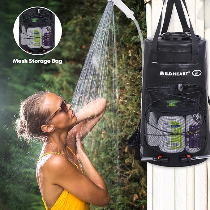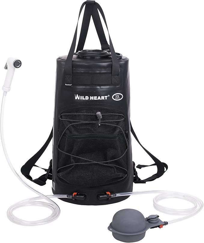 WILD HEART Camping Shower, 5.8 Gallons/22L Portable Camp Shower Bag with Upgraded Screw Lid, Water Level Window, Pressure Foot Pump, and Handy Nozzle, Solar Shower for Beach Camping Hiking Trip