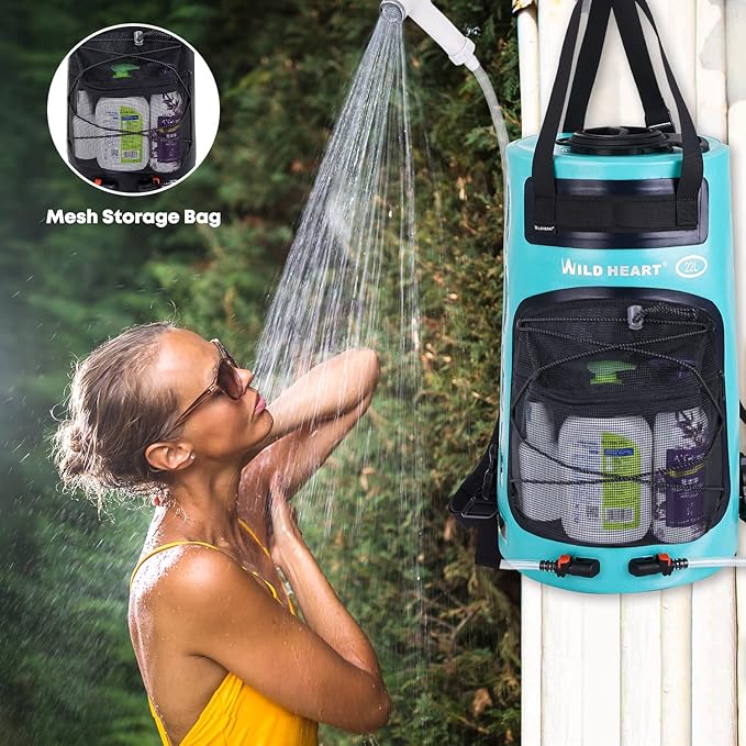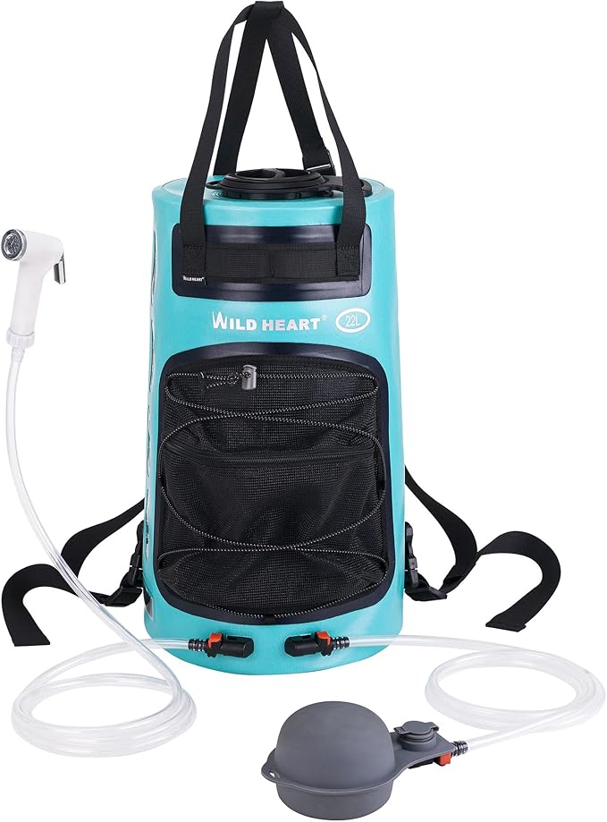 WILD HEART Camping Shower, 5.8 Gallons/22L Portable Camp Shower Bag with Upgraded Screw Lid, Water Level Window, Pressure Foot Pump, and Handy Nozzle, Solar Shower for Beach Camping Hiking Trip