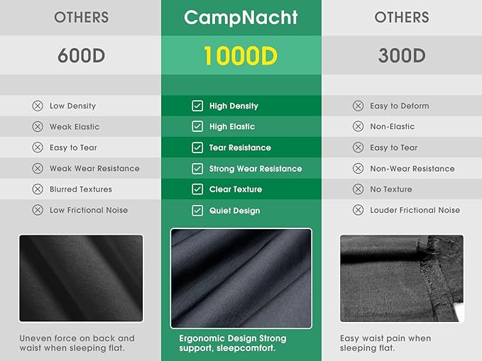 - đď¸ ăPremium Durable 1000D Fabrică Campnacht camping cot is made of anti tear 1000D oxford cloth for excellent strength and easy cleaning, which ensures a long service life and allows the bed surface to remain tight and comfortable. 1000D oxford fabric cloth is more breathable and is neither too hard nor too soft, giving you the perfect support to maintain the ideal sleeping position.