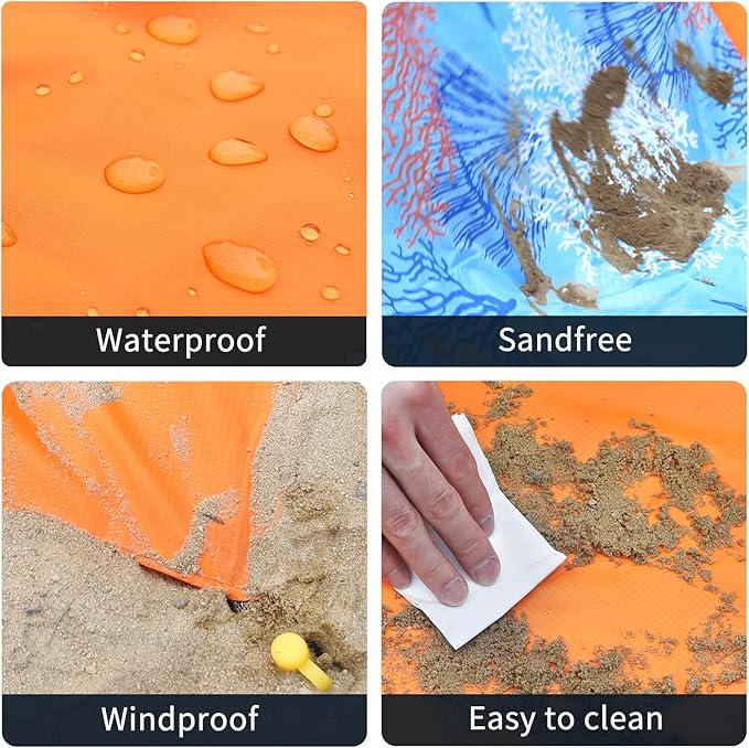 - [SANDPROOF & WATERPROOF] The beach mat is made of 210T polyester and PVC material, which is sturdy and tear resistant, effectively prevent torn or broken.the beach blanket is not only waterproof but sandproof. Gently shake the mat can move the water or sand away, can be kept clean at all times.