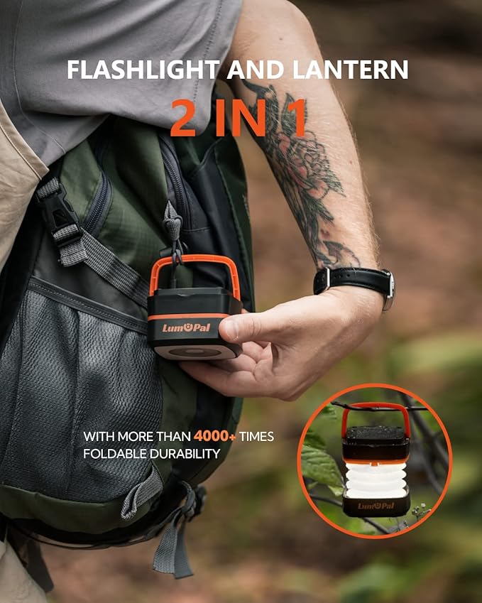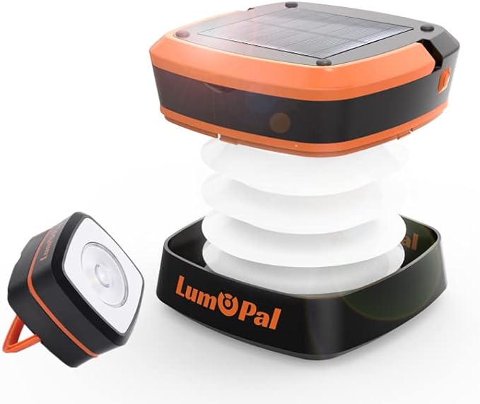 - Solar Lantern and Flashlight 2 in 1 - Lumopal collapsible solar camping lantern is a lantern when expanded, providing a 360° white light. When collapsed, it is a flashlight. With our collapsible solar lantern, light up and enjoy camping!