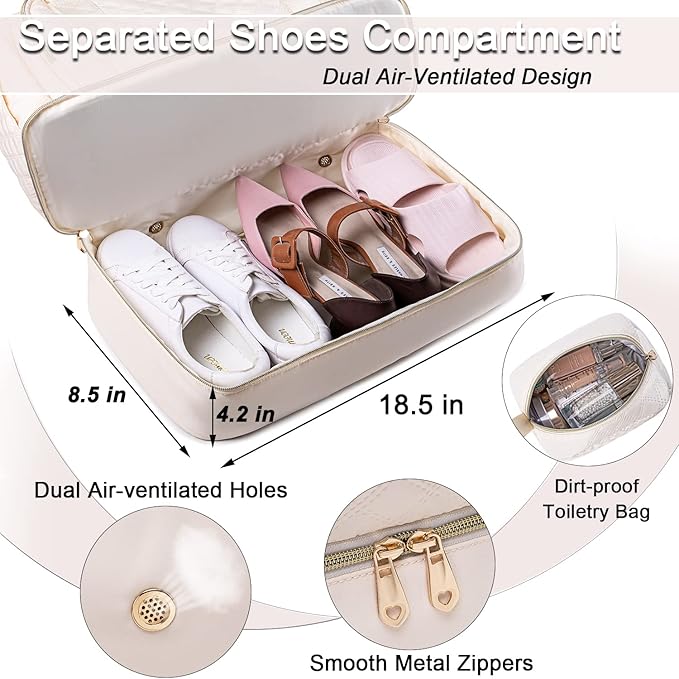 - 【Shoe Compartment With Vents】Weekender Bag With Shoe Compartment At The Bottom,Which have 2 Air Vents.The Shoe Compartment Size Is L18.5"X W8.5"X H4.2",It Can Be Used For Shoes And Clothes Storage,And Separated Design Is Helpful For Shoes Keeping,It Can Dispels Odors Of Shoes By Air-Vents. The Gym Bag With Shoes Compartment Is Ideal For Women Who Need An Extra Pair Of Shoes Or Clothes In Specific Places, Such As Those Who Like To Work Out In The Gym Or Dance In A Studio.